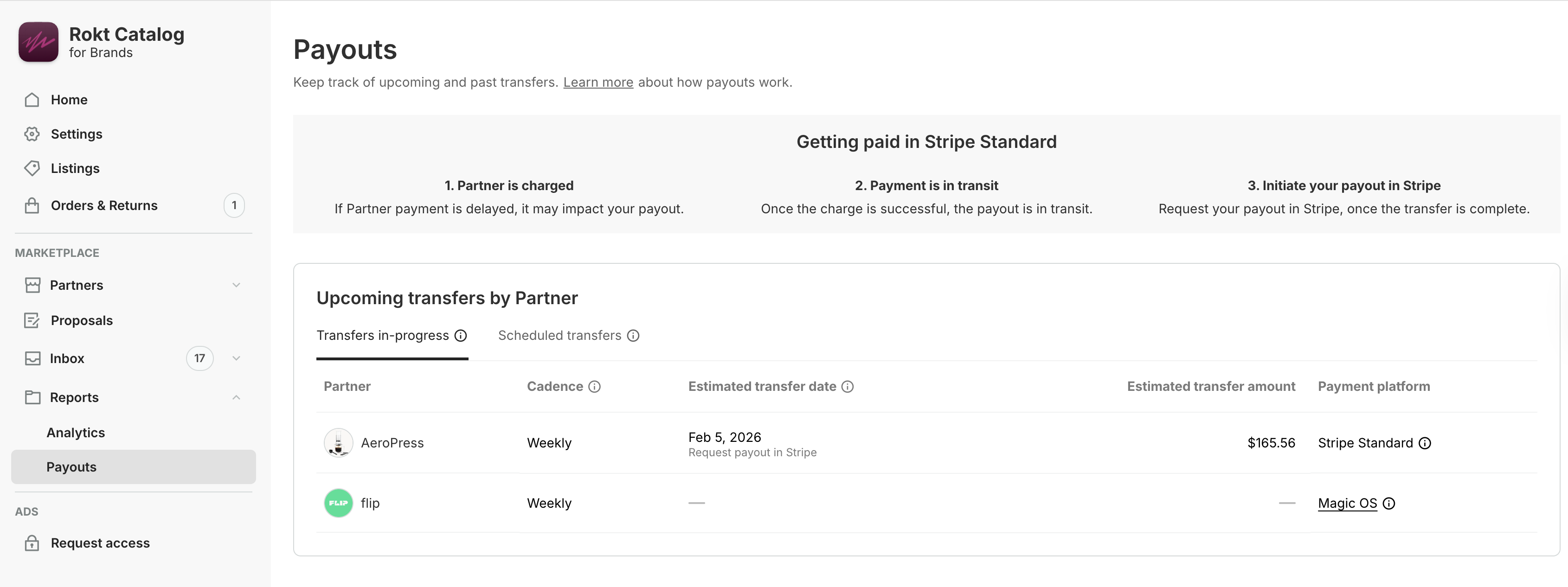 Once a payout is successfully dispersed to your bank, payout information will be displayed on the Payout page. To view payout information, navigate to Report > Payouts on the left side of the Catalog app.