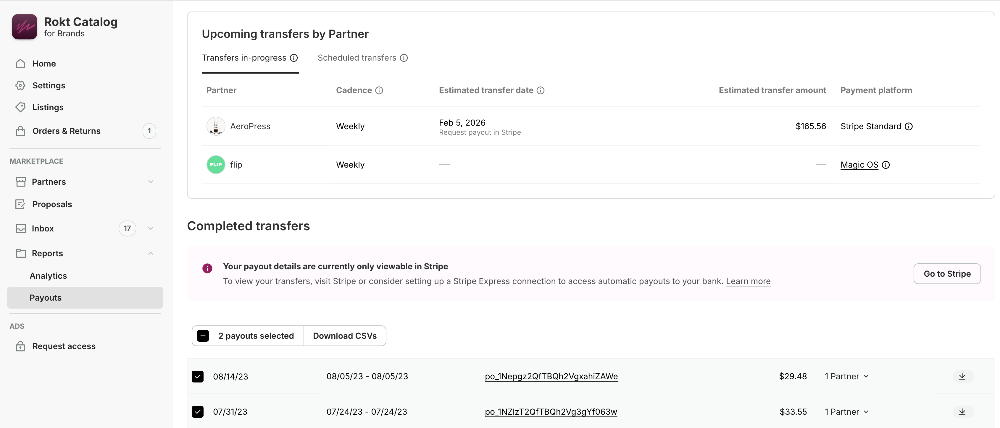 Catalog provides a downloadable CSV with a detailed breakdown for each payout. To download, click the download icon to the right of the payout, or bulk download by checking the boxes to the left of each report > Download CSV's.